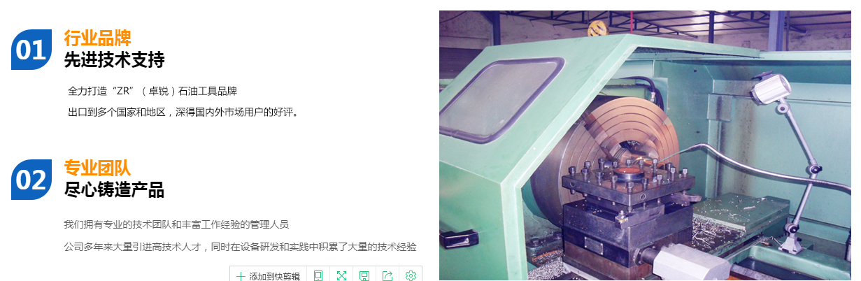 德州卓銳石油機械有限公司成立于2008年10月,專業生產螺桿鉆具拆裝架、無磁懸掛短節、螺桿鉆具配件、螺桿清膠機、PDC平面軸承、可調鉆具配件、360度全旋轉拆裝架、螺桿鉆具整機試驗臺、螺桿鉆具馬達試驗臺、渦輪鉆具配件、等壁厚螺桿定子加工機床、等壁厚螺桿鉆具等石油鉆井工具,打撈工具,固井工具及其配件。公司確立并始終堅持不懈地發揚“誠信,務實,高效,創新”的企業精神全力打造“ZR”(卓銳)石油工具品牌。業務實現了快速發展,并得到業內人士的廣泛認同,成為石油裝備制造業一顆璀璨的新星。